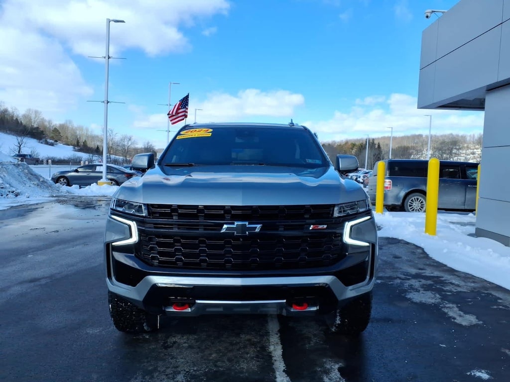 Leather Seats, Third Row Seat, Navigation, 4x4, Power Liftgate, Rear Air, Running Boards, Premium Sound System, Satellite Radio, Onboard Communications System Remote Trunk Release, Privacy Glass, Keyless Entry, Steering Wheel Controls. Chevrolet Z71 with Sterling Gray Metallic exterior and Jet Black interior features a 8 Cylinder Engine with 355 HP at 5600 RPM*.